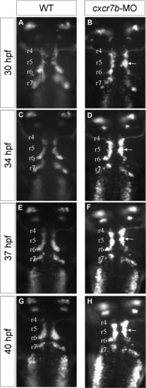 Time-lapse analyses of facial motoneuron phenotype in cxcr7b-MO embryo (dorsal view). Four time points from time-lapse observations during facial motoneuron migration on Islet-1-GFP wild type (A,C,E,G) and cxcr7b morphant (B,D,F,H) embryos. The time-lapse movie extends from 28 to 42 hpf and the time-points were 30 pf (A,B), 34pf (C,D), 37 pf (E,F) and 40 pf (G,H).The total length of the hindbrain shortens during this period of time, and the correspondence between the otic vesicle and r5 is progressively lost, however the position where a large number of cells are arrested in the morphant is easily followed during the time-lapse (arrow) and can be traced back to r5. |