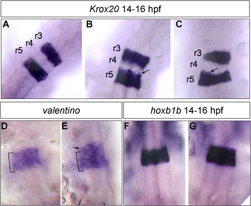 Normal rhombomere specification in cxcr7b-MO. Segmentation pattern of the hindbrain was examined with Krox20 (A–C), valentino (D–E) and hoxb1a (F–G). In most cases expression of the segmentation genes was normal, except in 30% of the injected embryos where the rhombomeric limits were irregular with a mild extension in Krox20 (B–C, arrows) and val (E, arrow) domains (n = 150). hoxb1a expression was not detectably affected (compare F and G) (n = 230). |