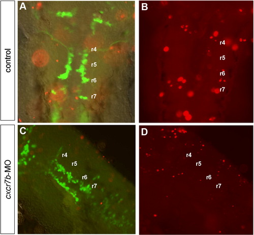 Cell death analysis using the TUNEL method (red) in control (A,B) and in cxcr7b-MO (C,D) embryos at 28–30 hpf. (A,B) A few apoptotic cells are observed in control embryos in the dorsal part of the hindbrain, scattered from r2 to r7. (A,C) Merge images of GFP and TUNEL labeling at the level of facial motoneuron migration show that GFP cells have a ventral position while apoptotic cells have a dorsal position in control (A) as well as cxcr7b-MO embryo (C). (B,D) Apoptotic cells are in focus at the level of dorsal hindbrain. (C,D) No labeling was observed predominantly localized in r3 or r5 in cxcr7b-MO. |