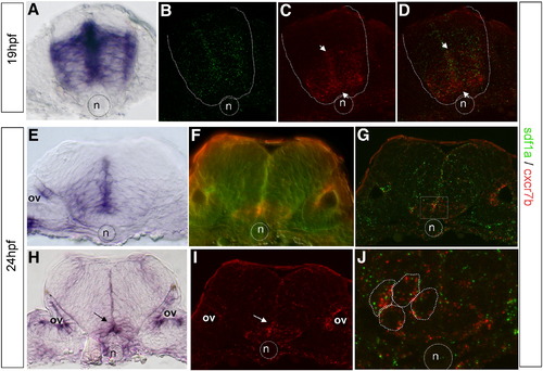 Co-expression of CXCR7 and SDF1 is restricted to a sub-population of neuroepithelial cell in r5. (A) Cross-sections at the level of r5 level at 19 hpf. Expression of sdf1a is intense in the germinal zone around the midline and is absent both in the dorsal region of the neural tube and in the floorplate. (B–D, F, G, I, J) Double insitu hybridization of sdf1a (green, B, F, G, J) and cxcr7b (red, C, F, G, I), the dotted line delimited the neural tube border and the dotted circle the notochord position. (C) cxcr7b is prominent in the ventral area of r5. The merge image indicates a co-expression in the ventral half of r5, arrows (D). (E–J) Expression patterns at 24 hpf. (E) Cross-section at the r5/r6 boundary (24 hpf) reveals sdf1a expression in the basal plate, most prominently within the periventricular region, with exclusion from the floor plate, arrows. (F) Double FISH after observation with Nomarski optic, which allow cell border visualization or confocal microscopy analysis (G). (I, J) Detection of cxcr7b (red) and sdf1a (green, arrows) in r5. (H, I) Cross-section through r5 shows that cxcr7b expression is restricted to a few cells adjacent to the floor plate, arrow. (J) Single merge image of a confocal Z-stack showing that both genes are expressed within the same cells (underlined, red and green spots). n = notochord, circle, ov = otic vesicle. |