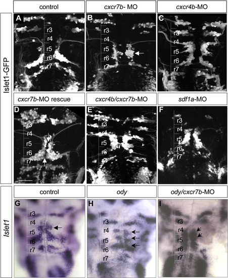 CXCR7b and CXCR4b are required for proper motoneuron migration. (A) In a control 48 hpf embryo, Isl1-GFP positive cells accumulate in r6. (B) ln cxcr7b-MO, most Isl1-GFP positive cells accumulate in r5 (arrow). (C) In cxcr4b-MO embryo, Isl1-GFP positive cells are present in r4 and r5, reflecting a partial impairment of migration. (D) In cxcr7b-mRNA injected (600 pg) embryos, a partial rescue is observed with no more accumulation in r5 but many Isl1-GFP cells remained close to the midline from r4 to r6 (arrows). (E) Double inactivation of cxcr4b and cxcr7b by MO results in facial migration defects compared to control Islet-1-GFP embryos (A). The most severe phenotype was characterized by GFP positive cell accumulation in r4 and r5 and an almost complete absence of cells in r6. Ectopic dendrites can be seen contralaterally (arrow) or toward the periphery (arrowhead). (F) A similar phenotype is observed in sdf1a-MO embryos: few cells are visible in r6 while motoneurons accumulate in r4 and r5. (G–I) Double ody/cxcr7b-MO embryos at 42 hpf (I) were compared to wild type (G) and to ody embryo (H) using Islet-1 in situ hybridization. In control, Islet-1 is expressed by facial motoneurons in r6 and by the abducens nucleus in r5 (arrow, G). Note that cells accumulate mainly in r4, r5 and r6 in ody mutant (H, arrows) while in ody/cxcr7b-MO Islet-1 cells are found in r4 and r5 with few cells in r6 (I, arrows), similar to the double morphant embryos (E). In all comparisons, control and mutant embryos were age-matched. Scale bar: 50 μm. |