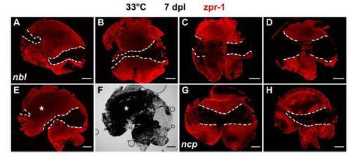 Cone regeneration defect in nbl and ncp mutants at the restrictive temperature. (A–E, G, and H) Flat-mounted retinas at 7 dpl immunolabeled with zpr-1 (red). (A–E) One retina from each of 5 nbl mutants. (F) Bright-field image of E. (G and H) One retina from each of 2 ncp mutants. Dashed lines, light-damaged areas that have few or no zpr-1–labeled cones; we cannot determine from these preparations whether the rare scattered cones sometimes observed within the light-damaged areas survived the lesion or have regenerated. Asterisk, attached retinal pigment epithelium. (Scale bars: 300 μm.) |
