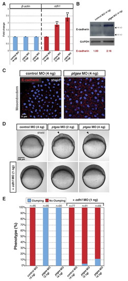 PGE2 governs cell adhesion by decreasing Cdh1 transcript and protein levels. (A) Quantitative real-time PCR (qRT-PCR) of β-actin (left) and cdh1 (right) transcript levels in control and ptges morphants at 60% epiboly. **, P<0.005. (B) Western blot of E-cadherin (top) and Gapdh (bottom, loading control) from shield-stage zebrafish embryos injected with control and ptges MOs. The two isoforms of E-cadherin present during zebrafish development have been described previously (Babb and Marrs, 2004); the larger isoform is dominant during gastrulation. (C) Confocal images of whole-mount E-cadherin immunostaining. E-cadherin protein expression (red) at the shield stage in the mesoderm (lateral view). Blue, nuclear stain. (D) Suppression of the cell clumping phenotype (arrowhead) in ptges morphants by cdh1 MO injection. Embryos are at the shield stage. (E) A compilation of two experiments in which control and ptges morphant embryos were co-injected with cdh1 MO (1 ng) and evaluated at 60% epiboly for the cell clumping phenotype. |