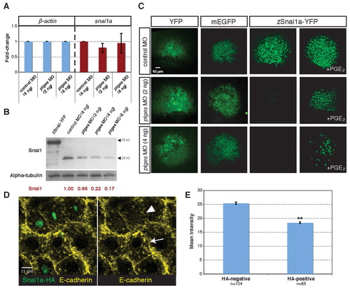 PGE2 deficiency destabilizes Snai1a protein. (A) qRT-PCR of β-actin (left) and snai1a (right) transcript levels in control and ptges morphants at 60% epiboly. (B) Immunoblotting using antibodies against Snai1a (top) and α-tubulin (loading control, bottom) in control and ptges morphants. The first lane shows zebrafish embryos that were injected with snai1a-yfp (which encodes a protein of 55 kDa). (C) Confocal images of Snai1a-YFP, YFP, and membrane EGFP expression in control (top row) and ptges morphants (middle and bottom rows), and ptges morphants incubated with PGE2 (shield stage). (D) Confocal images of ptges morphant gastrulae (shield stage) stained with anti-HA (green) and anti-E-cadherin (yellow) that were mosaically injected with snai1a-HA RNA (3 pg) at the 8- to 16-cell stage. Compare the intensity of E-cadherin staining at the membranes between two HA-positive cells (arrowhead) with that between two HA-negative cells (arrow). (E) Quantitation of E-cadherin immunostaining intensity (mean intensity) of Snai1a-HA-negative and Snai1a-HA-positive cells in ptges morphant gastrulae. **, P=1.16x10-10. |
