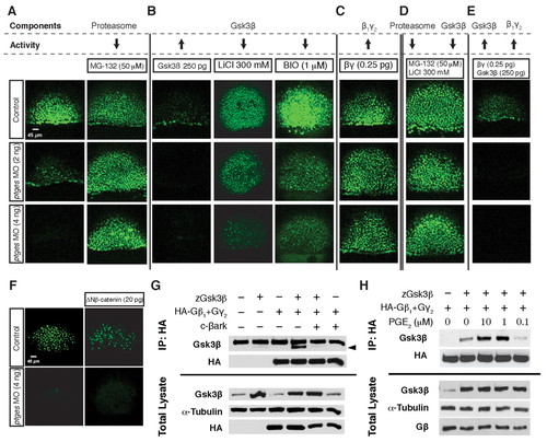 PGE2/Gβγ signaling stabilizes Snai1 by inhibiting Gsk3β-mediated proteasomal degradation. (A-E) Confocal images of zebrafish embryos in which the Snai1a-YFP assay was used to test downstream components of PGE2 signaling for their ability to affect levels of Snai1a in control (top row) and ptges morphants (middle and bottom rows). (A) Treatment with the proteasome inhibitor MG132. (B) Injection of zebrafish gsk3β RNA and treatment with the Gsk3β inhibitors LiCl and BIO. (C) Injection of human Gβ1 and Gγ2 RNA. (D) Inhibition of both Gsk3β and the proteasome (MG132 treatment). (E) human Gβ1γ2 and zebrafish gsk3β RNA co-injection. (F) Snai1a-YFP expression in control (top row) and ptges morphants (bottom row) injected with RNA encoding constitutively activeΔNβ-catenin. (G) Immunoblotting of Gsk3β following immunoprecipitation with human Gβ1γ2. Zebrafish Gsk3β and HA-tagged human Gβ1γ2 were transfected into HEK-293T cells. Cell extracts were immunoprecipitated with anti-HA, then immunoblotted with anti-Gsk3β (Gsk3β indicated by arrowhead). The interaction between Gsk3β and human Gβ1γ2 was blocked by the addition of c-βark (top). Total lysate western blots are shown at the bottom. (H) Immunoblotting of Gsk3β following PGE2 treatment and immunoprecipitation with human Gβ1γ2. Zebrafish Gsk3β and HA-tagged human Gβ1γ2 were transfected into HEK-293T cells, then cells were treated with 0.1, 1 and 10 μM PGE2 prior to collecting the cell extracts in NDLB. Cell extracts were immunoprecipitated with anti-HA, then immunoblotted with anti-Gsk3β. Total lysate western blots are shown at the bottom. |