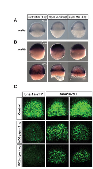 snai1a and snai1b transcript levels during gastrulation. (A) snai1a transcripts shown by in situ hybridization at 60% epiboly. (B) snai1b transcripts revealed by in situ hybridization at dome and 60% epiboly. Control and ptges morphants have indistinguishable expression until 60% epiboly, when the expression domain remains the same but fewer internalized snai1b-positive cells are present in the ptges morphants. (C) Snai1b-YFP expression is mildly decreased with injection of MO2-ptges. Embryos injected with synthetic RNAs encoding Snai1a-YFP (positive control) and Snail1-YFP are co-injected with MO2-ptges and imaged by confocal microscopy at the shield stage (6 hpf). Two representative embryos from each sample of snai1b-yfp-injected embryos are shown. |