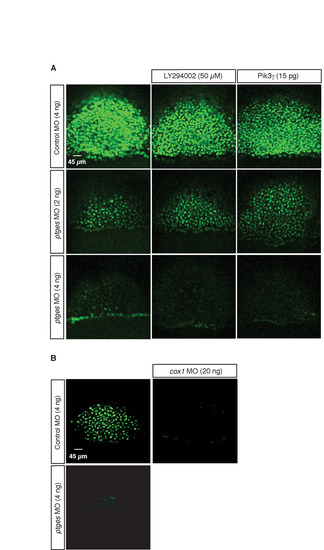 Pik3γdoes not significantly affect Snai1a stability. (A) Confocal images of embryos expressing Snai1a-YFP at the shield stage injected with either control or ptges MO that were either co-injected with RNA encoding Pik3γ (15 pg) at the one-cell stage or treated with Pik3 inhibitor (LY294002, 50 μM) from the dome to the shield stage (Montero et al., 2003). (B) Confocal images of embryos expressing Snai1a-YFP at the shield stage. Embryos co-injected with ptges MO and cox1 MO (20 ng). |