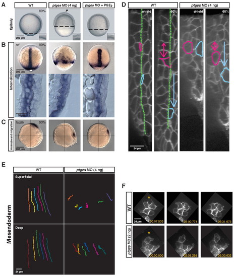 Depletion of PGE2 causes global gastrulation defects. ptges MO-injected (4 ng) zebrafish embryos were evaluated for gastrulation movement defects. (A) Live embryos (80% epiboly). WT, uninjected wild type; ptges MO (4 ng), Ptges-deficient; ptges MO (4 ng) + PGE2, Ptges-deficient embryos treated with 10 mM PGE2. Dashed line indicates the progress of epiboly. Arrowhead indicates the uneven surface of the blastoderm. The inset shows the blastoderm surface at high magnification. (B) (Top) Deficit of internalized no tail-expressing axial mesodermal cells in ptges morphants (90% epiboly; dorsal views). (Bottom) Lateral views of cryosections through the dorsal side of the embryo. Yolk cell, left; external surface, right; dashed line, germ layer boundary. (C) Migration of fzd8b-expressing prechordal mesoderm cells towards the animal pole (90% epiboly; lateral views). (D) Confocal images (lateral view) of the dorsal midline in membrane EGFP-labeled embryos at shield stage. Yolk cell, left; external surface, right. The green line marks the boundary between the superficial (blue cell) and deep layers (pink cell) of the gastrula. Arrows indicate the vector of movement. (E) The paths of six cells in the superficial and deep layers of the mesendoderm in wild-type and ptges morphant embryos. Vegetal pole, top; animal pole, bottom. (F) Confocal images of prechordal mesoderm cells (70% epiboly). Three frames from a time-lapse movie are shown. Orange asterisks are towards the animal pole. |