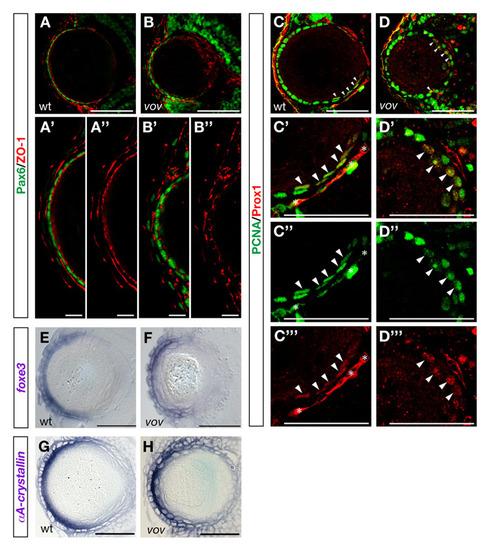 Expression of Pax6, ZO-1, Pcna, Prox1, foxe3 and αA-crystallin mRNA in wild-type and vov mutant embryos. (A,B) Expression of Pax6 (green) and ZO-1 (red) in wild-type (A) and vov mutant (B) lens at 72 hpf. (A′,B′) High magnification of anterior lens epithelium in A and B. (A′′,′′2) The same images of A and B shown through a red channel (ZO-1). In the vov mutant, ZO-1 signals underneath anterior lens epithelium are weaker than in wild type and sometimes discontinuous (B′′). (C,D) Expression of Pcna (green) and Prox1 (red) in wild-type (C) and vov mutant (D) lens at 72 hpf. In wild type, Pcna (green) is expressed strongly in the anterior lens epithelium and also weakly in four or five cells that pass over the region adjacent to the retinal CMZ (arrowheads, C); the latter are labeled with Prox1 (red). In the vov mutant, Pcna (green) is not only expressed in the anterior lens epithelium but also in cells located at the posterior edge of the lens sphere. Some Pcna-expressing cells strongly express Prox1 (red) at the posterior lens edge in the vov mutant (arrowheads, D). (C′) High magnification of the posterior lens region of C. (C′′,C′′′) The same image as C′ through a green (Pcna) or red (Prox1) channel. The Pcna and Prox1 double-positive cells seem to be early differentiating lens fiber cells. Asterisks indicate cells of intraocular blood vessels. (D′) High magnification of the posterior lens region in D. (D′′,D′′′) The same image as D2 through a green (Pcna) or red (Prox1) channel. Most posterior Pcna-positive cells are labeled with Prox1 (red, arrowheads), suggesting that posterior-positioned Pcna cells in the vov mutant are early differentiating lens fiber cells. (E,F) foxe3 mRNA expression of wild-type (E) and the vov mutant (F) lens at 72 hpf. foxe3 mRNA is expressed in the lens epithelium in wild type and the vov mutant. (G,H) Expression of crystallin αA mRNA in 72 hpf wild-type (N) and vov mutant (O) lens. crystallin αA mRNA is strongly expressed in differentiating lens fiber cells in wild type and the vov mutant. Scale bars: 50 µm, except 10 µm in A′,A′′,B′,B′′. |