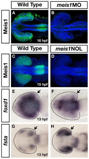 Two independent meis1 morpholinos result in similar phenotypes. (A-D) Two independent meis1 translation blocking morpholinos effectively knockdown Meis1 protein, as shown by whole mount immunohistochemistry using a Meis1 monoclonal antibody. Hoechst 33258 stain marks the nuclei. (E-H) The meis1 non-overlapping (NOL) morpholino gives similar phenotypes as the ATG-morpholino (compare with Figure 5A-D and Figure 6F, G). meis1NOL morphants exhibit reduced foxd1 expression in the presumptive temporal retina (n = 27/29) (E, F), and upregulated fsta expression in the eye at 13 hpf (n = 19/19) (G, H). Dotted lines outline the optic vesicle. Views are dorsal with anterior to the left. |