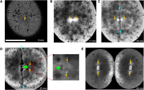 EMTB-3GFP Transgenic Zebrafish Embryos Allow Live Imaging of Microtubule Organization in Large Cells Orange arrows indicate positions of centrosomes.(A) Shortly after fertilization, sperm aster expands throughout the cell. The scale bar represents 200 μm. (B) Before metaphase, sperm aster breaks down and first mitotic spindle forms. (C) During anaphase-telophase, astral microtubules grow out, and centrosomes move apart. An interaction zone forms in the plane where sister asters contact each other (between blue arrows). (D) Centrosomes separate and align in the direction of the future spindle during late telophase (see enlargement). The centrosomes in the left aster are out of focus. Nuclei (green arrow) follow centrosomes, lagging behind. (E) Second mitotic spindles assemble after cytokinesis (E is taken from different embryo). See also Figure S2 and Movies S1 and S2. |