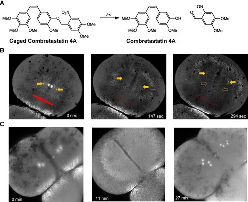 Aster Movement Depends on Dynein-Dependent Pulling Forces (A) Structure of caged combretastatin 4A. (B) EMTB-3GFP zebrafish embryos were incubated in caged combretastatin and subjected to UV irradiation in defined region (marked in red). Within seconds, microtubules depolymerized selectively on the irradiated side. The remaining aster moved away from the irradiated region, arguing for pulling forces on asters. Full arrows mark the positions of centrosomes; hollow arrows on right mark their original positions. (C) Injection of p150-CC1 blocks aster movement. Asters still grew out and broke down under cell-cycle control but lost their ability to move or orient centrosomes. See also Figure S3 and Movies S3 and S4. |