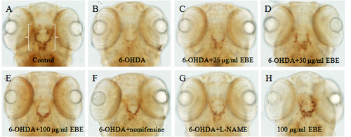 EBE recovered 6-OHDA-induced dopaminergic neuron loss in zebrafish. (A-H) 2 dpf zebrafish was exposed to 250 μM 6-OHDA and different concentrations of EBE or 100 μM Nomifensin or 100 μM L-NAME or 100 μg/mL EBE for 24 hours, except the control. The viability of dopaminergic neurons of the zebrafish (indicated by white brackets) was evaluated with anti-tyrosine hydroxylase (TH) immunostaining. Ventral view: anterior to the top. |