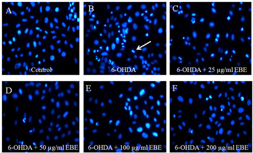 EBE reduced apoptosis induced by 6-OHDA in PC12 cells. Cells were stained with DNA-binding fluorescent dye Hoechst 33342. (A) Control: untreated group; (B) 6-OHDA-treated group (1 mM, 8 hours): chromatin condensation and DNA fragmentation were indicated by the white arrows; (C-F) EBE-pretreated groups (25, 50, 100 and 200 μg/mL respectively, 12 hours), followed by 6-OHDA exposure (1 mM, 8 hours): less apoptotic bodies were identified, colony reduction and cell shrinkage induced by 6-OHDA were also reversed. |
