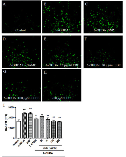 EBE inhibited 6-OHDA-induced nitric oxide (NO) over-production in PC12 cells. PC12 cells were pretreated with or without 250 μM L-NAME, 100 μM SNP and 25, 50, 100 and 200 μg/mL EBE for 12 hours, then exposed to1 mM 6-OHDA for another hour. (A-H) Intracellular NO was identified using fluorescent indicator, DAF-FM diacetate; (I) The NO fluorescent intensity was quantified by a multi-label counter. ++ P = 0.008 versus control group (without 6-OHDA treatment); * P = 0.044 versus OHDA group; ** P = 0.005 versus OHDA group. All experiments were repeated 3 times. |