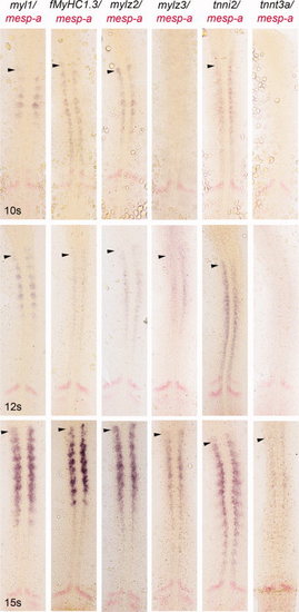 Expression pattern of early markers for fast-twitch muscles. Whole-mount in situ hybridization showing expression of myl1, fMyHC1.3, mylz2, mylz3, tnni2, and tnnt3a in embryos at 10-, 12-, and 15-somite stages. Expression of myl1, fMyHC1.3, mylz2, and tnni2 is detected in the paraxial mesoderm at 10-somite stage, mylz3 expression is first detected at 12-somite stage, and tnnt3a starts to be expressed at 15-somite stage. mesp-a (in red) labels somite primordia. Arrowheads indicate the earliest expressing somite. |