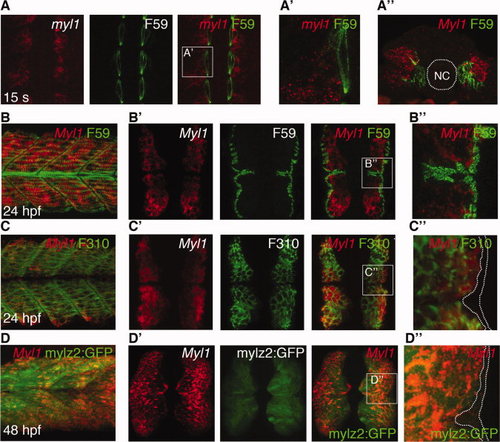 Fibre-type specific expression of myl1. A: Expression of myl1 (red) was detected in the fast domain of the paraxial mesoderm in a 15-somite-stage flat-mounted embryo using fluorescent in situ hybridisation. Labelling of adaxial cells/slow fibres using F59 antibody (green) showed no overlap with the myl1 staining. A2: Blow-up of a single somite as indicated by square in A. A3: Transverse section of 15-somite-stage embryo. NC, notochord. Labelling of adaxial cells/slow fibres using F59 antibody (green) showed no overlap with the myl1 staining. B: Lateral view of 24-hpf embryo stained with F59 antibody (green), labelling slow fibers and myl1 antisense probe (red). B2: Transverse sections of 24-hpf embryo where slow fibres, detected with F59 antibody (green), showed no co-localisation with myl1 antisense probe (red). B3: Blow-up of region boxed in B2. C: Lateral view of 24-hpf embryo where F310 antibody (green) labelling fast fibres is detected in myl1-positive fibres (red). C2: Transverse sections of 24-hpf embryo where fast fibres detected with F310 antibody (green) co-localised with myl1 antisense probe (red). C3: Blow-up of region boxed in C2. D: Lateral view of 48-hpf Tg(mylz2:GFP)i135 transgenic embryo where GFP+ fast fibres were co-labelled with myl1 antisense probe (red). D2: Transverse sections of 48-hpf Tg(mylz2:GFP)i135 transgenic embryo where GFP+ fast fibres were co-labelled with myl1 antisense probe (red). D3: Blow-up of region boxed in D2. |