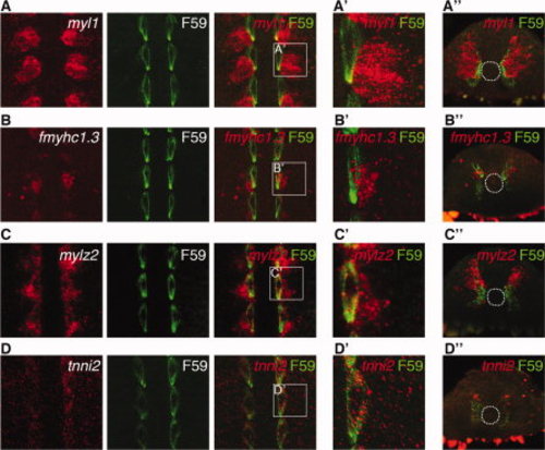 myl1 is the only skeletal fast muscle marker restricted to the skeletal fast muscle domain at 12-somite stage. A: Expression of myl1 (red) is excluded from F59-positive adaxial cells (green) and is specific to the fast domain at 12-somite stage. A2: Blow-up of region boxed in A. A3: Transverse section of 12-somite-stage embryo. B: fmyhc1.3 (red) is co-expressed with F59-positive adaxial cells (green) and is non-specific to the fast domain at 12-somite stage. B2: Blow-up of region boxed in B. B3: Transverse section of 12-somite-stage embryo. C: mylz2 (red) is co-expressed with F59-positive adaxial cells (green) and is non-specific to the fast domain at 12-somite stage. C2: Blow-up of region boxed in C. C3: Transverse section of 12-somite-stage embryo. D: tnni2 (red) is co-expressed with F59-positive adaxial cells (green) and is non-specific to the fast domain at 12-somite stage. D2: Blow-up of region boxed in D. D3: Transverse section of 12-somite-stage embryo. |