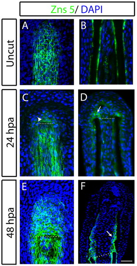 Zns5 expression domains during early stages of fin regeneration. (A-F) Immunostaining with Zns5 antibody in (A,C,E) whole mount and (B,D,F) longitudinal cryosections of (A,B) uncut, (C,D) 24 hpa, (E,F) 48 hpa fins. The arrowhead in C indicates Zns5-positive cells at the blastema. The arrows in D and F indicate aligning scleroblasts. Scale bar: 50 μm (45 μm in B). Dashed lines indicate amputation plane. |