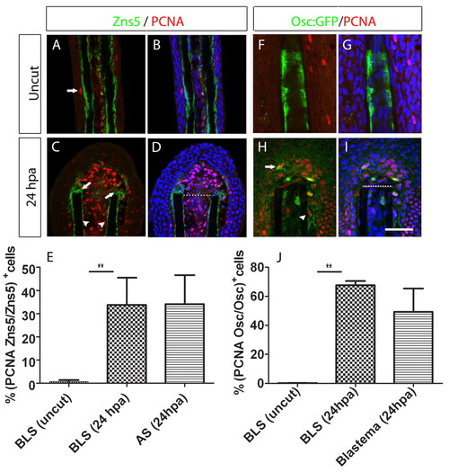 Proliferation of bone-lining cells increases upon amputation of the caudal fin. (A-D) Double immunohistochemistry with PCNA and Zns5 antibody in wild-type fins. (A,B) Uncut and (C,D) 24 hpa fins. (A,C) Zns5 (green) and PCNA (red). (B,D) Zns5 (green), PCNA (red) and DAPI (blue). The arrow in A indicates an proliferating epidermal cell. The arrowheads in C indicate proliferating BLSs and the arrows indicate aligning proliferating scleroblasts. (E) Percentage of the total Zns5-positive cells that were also positive for PCNA in the BLS and AS populations, calculated for the first segment below and above the amputation plane at 24 hpa, and in the equivalent region of uncut fins. There was a significant increase in double-positive BLSs in the 24 hpa samples compared with uncut samples (Student′s t-test, P<0.05; n=5 for each condition). (F-I) Double immunohistochemistry with GFP and PCNA antibody in Tg(osteocalcin:GFP) fins. (F,G) Uncut fin. (H,I) 24 hpa fin. (F,H) osteocalcin:GFP (green) and PCNA (red). (G,I) osteocalcin:GFP (green), PCNA (red) and DAPI (blue). In H, the arrow indicates a proliferating osteocalcin-expressing cell within the blastema; the arrowhead indicates a proliferating osteocalcin-expressing BLS. (J) Percentage of cells double-positive for osteocalcin:GFP and PCNA over the total osteocalcin:GFP-positive cells, in the BLS and blastema populations, calculated for the first segment below and above the amputation plane at 24 hpa, and in the equivalent region of uncut fins. There was a significant increase in double-positive BLSs in the 24 hpa samples compared with uncut samples (Student′s t-test, P<0.05; n=5-8 for each condition). Scale bar: 100 μm in A,B,F-I and 75 μm in C,D. Dashed lines indicate amputation plane. |