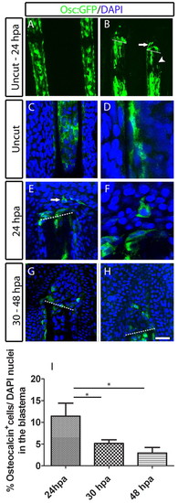 Presence of GFP-positive osteocalcin-reporter cells in the blastema upon amputation of the caudal fin. (A,B) osteocalcin-reporter expression in Tg(osteocalcin:GFP) fins. (A) Uncut fin. (B) 24 hpa fin. The arrow indicates osteocalcin-expressing cells at the blastema and the arrowhead indicates the lack of the osteocalcin reporter expression. (C-H) Immunohistochemistry for GFP in Tg(osteocalcin:GFP) fins. (C,D) Uncut fin. (E,F) 24 hpa fin. The arrow indicates osteocalcin-expressing cell in the blastema. D and F are magnified optical slices of C and E, respectively. (G) 30 hpa fin. (H) 48 hpa fin. (I) Percentage of osteocalcin:GFP-expressing cells over the total DAPI-stained nuclei in the blastema population. There were significantly fewer osteocalcin:GFP-expressing cells at 30 and 48 hpa than at 24 hpa (Student′s t-test, P<0.05; n=11-13 for each condition). Scale bar: 115 μm in A; 100 μm in B; 50 μm in C,E,G,H; 20 μm in D and F. Dashed lines indicate amputation plane. |