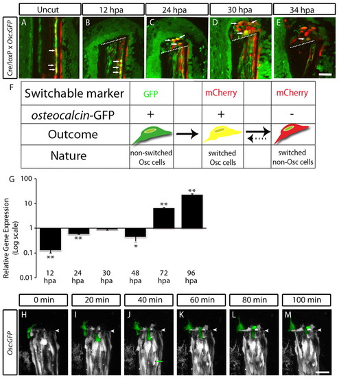 Dedifferentiating osteocalcin-positive scleroblasts at the blastema start to express de novo osterix at 48 hpa. (A-F) Osterix mRNA expression detected by fluorescence in situ hybridization followed by immunohistochemistry against GFP in Tg(osteocalcin:GFP) fins. (A-C) 24 hpa fin. The arrow indicates a osteocalcin-positive cell at the blastema that does not express osterix mRNA, labelled with Fast Red. (D-F) 48 hpa fin. The arrows indicate double positive cells co-expressing osterix mRNA and osteocalcin:GFP. The images are each projections of several confocal optical slices. Scale bar: 50 µm. Dashed lines indicate amputation plane. |
