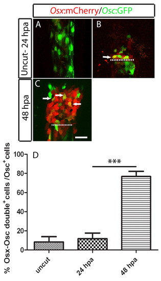 osteocalcin-positive scleroblasts at the blastema start to express de novo osterix, an early marker for skeletal differentiation. (A-C) osterix- and osteocalcin-reporter expression in double Tg(osterix:mCherry; osteocalcin:GFP) fins. (A) Uncut fin. (B) 24 hpa fin. (C) 48 hpa fin. In B and C the arrows indicate cells co expressing osterix and osteocalcin. Each image is a projection of several confocal optical slices. (D) Percentage of double-positive, osterix- and osteocalcin-expressing cells over the total of osteocalcin-expressing cells in the blastema population. There was a significant increase at 48 hpa compared with the uncut and 24 hpa samples (Student′s t-test, P<0.05; n=5 or 6 for each condition). Scale bar: 50 μm. Dashed lines indicate amputation plane. |