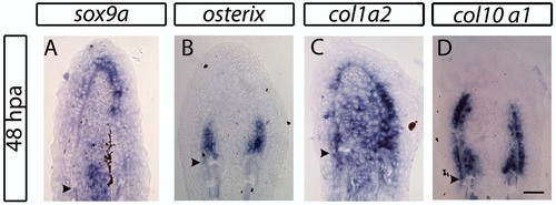 Expression domains of skeletogenesis-associated genes during the early stages of blastema formation. (A-D) In situ hybridization on 48 hpa longitudinal sections showing expression of (A) sox9a, (B) osterix, (C) collagen1a2, (D) collagen10a1. Scale bar: 50 μm. Arrowheads indicate the amputation plane. |