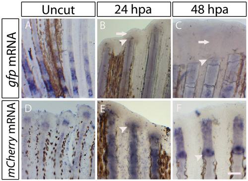 Expression of the reporter genes in the transgenic lines: Tg(osterix:mCherry) and Tg(osteocalcin:GFP) during early stages of caudal fin regeneration. (A-F) Whole-mount in situ hybridization for the reporter genes. (A-C) Detection of gfp mRNA in the Tg(osteocalcin:GFP) fins. (A) Uncut proximal portion of the fin before the fin bifurcation. (B) 24 hpa fin. (C) 48 hpa fin. Arrows in B and C indicate the absence of gfp mRNA at the blastema. (D-F) Detection of mCherry mRNA in the Tg(osterix-mCherry) fins. (D) Uncut distal portion of the fin. (E) 24 hpa fin. (F) 48 hpa fin. Scale bar: 100 μm in regenerating fins; 200 μm in uncut fins. Arrowheads indicate the amputation plane. |