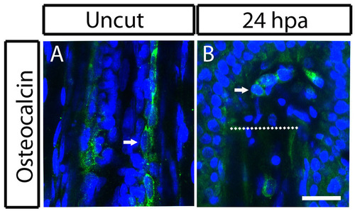 Blastema cells still expresses Osteocalcin 24 hours postamputation of the zebrafish caudal fin. (A,B) Immunohistochemistry for Osteocalcin. (A) Uncut fin. (B) 24 hpa fin. In A, the arrow indicates Osteocalcin-producing bone lining cell. In B, the arrow indicates Osteocalcin-producing cell in the blastema. Scale bar: 50 µm for all panels. Dashed lines indicate amputation plane. |