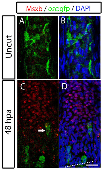 Osteocalcin reporter cells at the blastema do not express Msxb, the marker for the undifferentiated state. (A-D) Immunohistochemistry for osteocalcin:GFP and Msxb protein on 50 μm sagittal sections. (A,B) Uncut fin. (C,D) 48 hpa fin. The arrow in D indicates a osteocalcin-expressing cell that is not positive for Msxb. Scale bar: 50 μm for all panels. Dashed lines indicate amputation plane. |