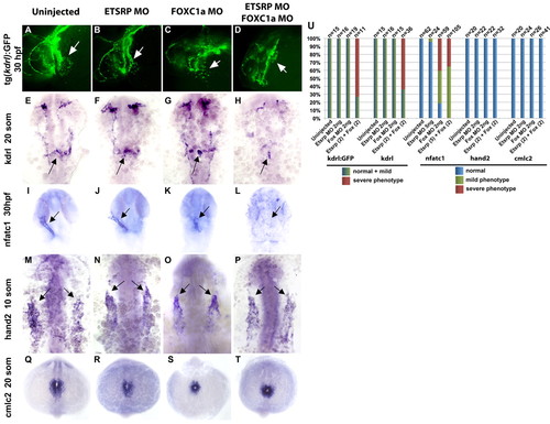 Simultaneous Foxc1a and Etsrp knockdown affects endocardial but not myocardial development. (A-L) Endocardial markers kdrl:GFP at 30 hpf (A-D, arrows), kdrl at the 20-somite stage (E-H, arrows) and nfatc1 at 30 hpf (I-L, arrows) show no or only a slight reduction in expression in embryos injected with low doses of either 2 ng Etsrp MO (B,F,J) or 2 ng Foxc1a MO (C,G,K) compared with uninjected controls (A,E,I). However, upon simultaneous knockdown of Etsrp and Foxc1a, levels of all of these endocardial markers are severely reduced (D,H,L). (M-T) Myocardial hand2 expression at the 10-somite stage (M-P, arrows show anterior border) and cmlc2 at the 20-somite stage (Q-T) are not significantly affected in 2 ng etsrp MO-injected (N,R), 2 ng Foxc1a MO-injected (O,S) or Etsrp/Foxc1a MO co-injected (P,T) embryos compared with uninjected controls (M,Q). (A-D) Whole-mount fluorescent images of fixed Tg(kdrl:GFP) embryos at 30 hpf, anterior is towards the left, dorsal is upwards. (E-P) Ventral flat-mount view of in situ hybridization analysis, anterior is upwards. (Q-T) Anterodorsal whole-mount view, anterior is upwards. (U) Phenotypic distribution of endocardial kdrl:GFP, kdrl, nfatc1 and myocardial hand2 expression in etsrp, foxc1a and etsrp/foxc1a MO-injected embryos. The blue bars represent no change, whereas the green and red bars indicate mild and severe reduction in endocardial expression, respectively. Note that for kdrl:GFP and kdrl expression, normal or mildly reduced categories are combined and shown in dark green because it was difficult to distinguish the two categories. PHENOTYPE: