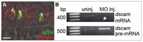 dscam mRNA is expressed in CaPs and VaPs and wildtype transcripts were knocked down with SBMOs. A. A projected confocal stack of dscam mRNA (red) and isl2a mRNA (a CaP/VaP motoneuron marker [41]) expression (green), reveals that at 24 hpf dscam is expressed in both CaP and VaP (*; CaP and VaP pair to left, single CaP to right) as well as other cells that are likely motoneurons. B. RT-PCR results confirming uninjected embryos have wildtype dscam mRNA (395 bp band) while MO-injected embryos have increased dscam pre-mRNA (490 bp band). Starred lanes show dscam transcripts are absent after injecting 8.4 ng of dscam SBMO. Scale bar = 20 μm. EXPRESSION / LABELING: