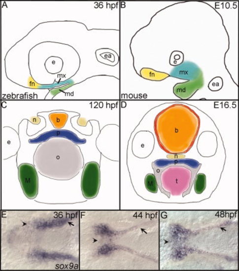 Comparison of zebrafish and mouse palatogenesis with a detailed look at zebrafish palate formation. A,B: Outlines of embryos (lateral view), after CNCC condensation in the frontonasal (yellow), maxillary (turquoise), and mandibular (green) domains of zebrafish (A) and mouse (B). C,D: Drawings of cross-sections through heads of zebrafish (C) and mouse (D) after formation of the palate. Colors correspond to similar structures across both species. E,F,H: In situ hybridization of sox9a expression marking the palatal CNCC in zebrafish, ventral view with anterior to the left is shown, and mandibular crest have been removed to allow full view of the developing palate. E: At 36 hours postfertilization (hpf), sox9a expression marks the CNCC that line the maxillary (arrow) and the frontonasal (arrowhead) domains before their migration to the midline. F: Migration of frontonasal cells to the midline to begin the formation of the ethmoid plate (arrowhead) at 44 hpf and maxillary cells (arrow) begin rearrangements to form the trabeculae rods of the palate. G: By 48 hpf, most, if not all, frontonasal CNCC have migrated to the midline (arrowhead) and trabeculae rods are well formed in the palate (arrow). fn, frontonasal CNCC; mx, maxillary CNCC; md, mandibular CNCC; e, eye; ea, ear; b, brain; n, nasal opening; p, palate; o, oral opening; t, tongue; M, Meckel′s. |