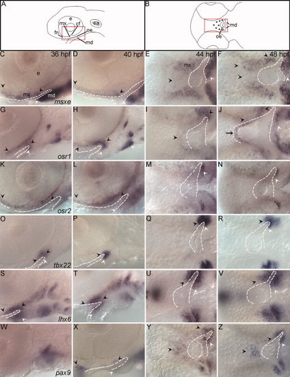 Transcription factors important in amniote palatogenesis are expressed during development of the zebrafish palate. A,B: Schematics representing lateral view of 36, 40 hours postfertilization (hpf) and ventral view at 44, 48 hpf RNA in situ hybridizations respectively, asterisks mark palate-forming cranial neural crest cells (CNCC). C,D,G,H,K,L,O,P,S,T,W,X: Lateral views at 36 and 40 hpf and E,F,I,J,M,N,Q,R,U,V,Y,Z: ventral views at 44 and 48 hpf are shown. Arrowheads indicate areas of CNCC expression domains, black for palatal precursor CNCC and white for mandibular CNCC, while arrows mark expression in oral ectoderm. In all images the oral ectoderm is outlined by white dashes to aid in its visualization. C–F: msxe is expressed in frontonasal, maxillary and mandibular cranial neural crest cells (CNCC) from 36 hpf to 48 hpf. G–J: osr1 expression is restricted to maxillary and a small portion of mandibular CNCC from 36 to 40 hpf and then also includes dorsal oral ectodermal cells at 44 to 48 hpf. K–N: osr2 is expressed in the frontonasal and maxillary CNCC at 36 and 40 hpf. At 44 and 48 hpf osr2 expression becomes restricted to a subpopulation of the mandibular CNCC expression. O–R: The expression domain of tbx22 in CNCC increases with time and is limited to the posterior maxillary and mandibular domains, wrapping around the oral ectoderm. S–V: CNCC express lhx6, wrapping around the oral ectoderm. This expression includes both the maxillary and mandibular domains and extends further than tbx22 into more anterior crest cells within each domain. W–Z: pax9a is not expressed at 36hpf in the first arch, but is expressed in the frontonasal and posterior maxillary CNCC from 40 to 48 hpf with a small area of expression in the oral ectoderm. e,eye; mx, maxillary domain; md, mandibular domain; fn, frontonasal CNCC; cf, choroid fissure; oe, oral ectoderm; ea, ear. |