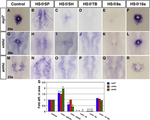 Effects of increased Wnt signaling on CM differentiation markers. (A–F) myl7, (G–L) vmhc and (M–R) amhc expression in representative HCSEs and embryos when Wnt signaling is increased using the Tg(hsp70l:wnt8a-GFP)w34 line at the designated stages. Increased Wnt signaling promoted (B,H,N) and then inhibited (C–E,I–K,O–Q) the expression of CM differentiation markers when Wnt signaling was increased prior to gastrulation at the sphere (SP) stage and from the initiation of gastrulation [shield (SH)] through early somitogenesis. (F,L,R) Increasing Wnt signaling at 16 s does not overtly affect CM differentiation markers. (S) Graph indicating the fold difference in areas of cardiac differentiation marker expression. Asterisks indicate a statistical difference in the areas from HCSEs and GFP + embryos in Supplemental Table 1 according to Student′s t-test. Images in all figures are dorsal views with anterior up, unless otherwise indicated. |