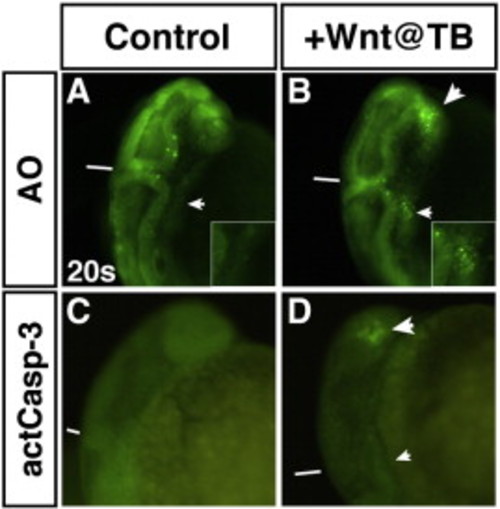 Increased Wnt signaling at the TB stage causes cell death independent of Caspase-3 activation. (A,C) HCSEs. (B,D) GFP + sibling embryos. (A,B) Embryos at 20 s with AO staining to detect dying cells. There is increased cell death in the LPM at 20 s after increasing Wnt signaling at TB (B; small arrowhead and inset) compared to HCSEs (A; arrow and inset). Significant cell death was also observed in the anterior neural tissue (large arrowhead in B). (C,D) Embryos at 20 s with whole mount immunohistochemical analysis of activated Caspase-3. (D) Activated Caspase-3 is not detected in the LPM where AO staining is observed at 20 s after increasing Wnt signaling at the TB stage (small arrowhead). However, there is substantial activated Caspase-3 detected in the anterior neural tissues (large arrowhead), which is also observed with AO staining (B). Views in A and B are dorso-lateral. Views C and D are lateral. Lines in A–D indicate the position of the midbrain–hindbrain boundary. CPs/CMs are located immediately posterior to this boundary in the LPM. |
