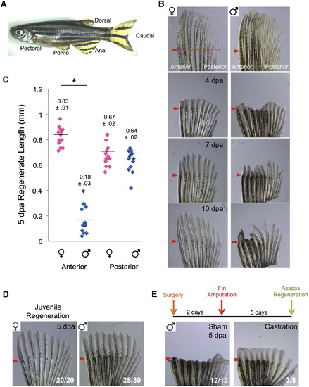 Sexually Dimorphic Regeneration of Zebrafish Pectoral Fins (A) Adult zebrafish, showing locations of fin types. (B) Comparison of female and male pectoral fin regeneration. Male regenerative defects were clear at 4 days postamputation (dpa) and remained in most animals through 7 and 10 dpa. Arrowheads indicate amputation plane. (C) Male regenerative failures were present in anterior rays (n = 13, mean ± standard error of the mean [SEM]). *p < 0.001 by Student′s t test. (D) Juvenile fish (2 months old) of either sex proficiently regenerated pectoral fins. (E) Castration rescued regeneration of both pectoral fins in 38% of male animals, assessed at 5 dpa. |