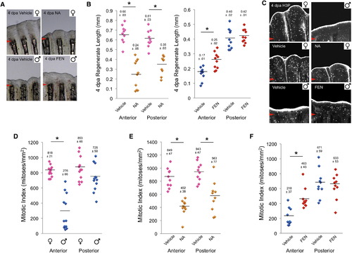 Androgen Signaling Inhibits Blastemal Proliferation (A) Top: 4 days of androgen treatment (1 μg/ml NA) after amputation inhibited pectoral fin regeneration in females. Bottom: androgen receptor antagonist treatment (1 μg/ml FEN) for 4 days after amputation improved male fin regeneration. Anterior regions are shown. Arrowheads indicate amputation plane. (B) Quantification of effects of NA on female fin regeneration (left) (n = 10; *p < 0.001 by Student′s t test) and FEN on male fin regeneration (right) (n = 10; *p < 0.005 by Student′s t test). (C) Top: blastemal proliferation in anterior portions of male and female 4 dpa pectoral fin regenerates, assessed by phosphorylated histone H3 (H3P) staining. Images are confocal projections of the medial 10 μm of mesenchyme; the anti-H3P antibody also nonspecifically stains the fin epidermis. Middle: blastemal proliferation in females treated with vehicle or NA. Bottom: blastemal proliferation in males treated with vehicle or FEN. Anterior regions are shown. (D) Quantification of blastemal proliferation in females and males (n = 12). *p < 0.001 by Student′s t test. (E) Quantification of effects of NA on female blastemal proliferation (n = 10). *p < 0.001 by Student′s t test. (F) Quantification of effects of FEN on male blastemal proliferation (n = 10). *p < 0.001 by Student′s t test. |
