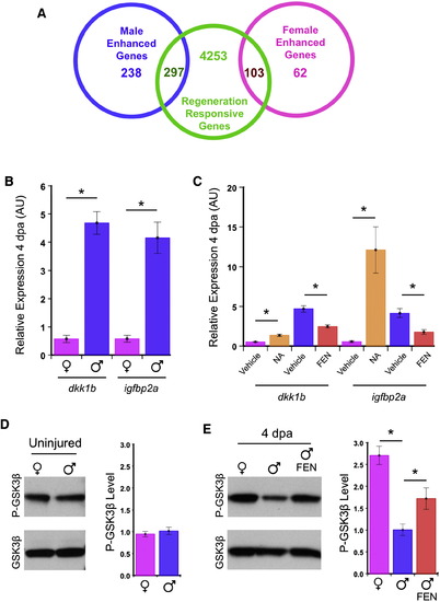 Sexually Dimorphic Gene Expression and GSK3β Regulation in Regenerating Fins (A) Venn diagram displaying numbers of genes influenced by sex or regeneration (4 dpa) and their overlaps. (B) Increased expression of dkk1b and igfbp2a in the anterior regions of regenerating male pectoral fins compared with females (n = 3, mean ± SEM). *p < 0.05 by Student′s t test, normalized to β-actin1. AU indicates arbitrary units. (C) NA treatment of females increased dkk1b and igfbp2a levels during anterior pectoral fin regeneration, whereas FEN treatment of males reduced their expression (n = 3, mean ± SEM). *p < 0.05 by Student′s t test, normalized to β-actin1. (D) Uninjured male and female zebrafish pectoral fins have similar levels of inactive P-GSK3β. Values are normalized to the male P-GSK3β level (n = 3, mean ± SEM). (E) Upon injury and regeneration, females increase P-GSK3β levels. Male P-GSK3β levels appear stable during regeneration but can be enhanced by androgen receptor antagonism. Values are normalized to the vehicle-treated male P-GSK3β level (n = 4, mean ± SEM). *p < 0.05 by Student′s t test. |