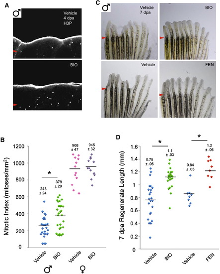 GSK3 Inhibition Rescues Fin Regeneration (A) Blastemal proliferation in anterior portions of 4 dpa pectoral fin regenerates from vehicle- and BIO-treated males, assessed by H3P staining. Arrowheads indicate amputation plane. (B) Treatment with 100 nM BIO for 4 days after amputation increased male anterior blastemal proliferation by 56%. Female blastemal proliferation was not affected by BIO (n = 26–30 males, n = 12 females). *p < 0.001 by Student′s t test. (C and D) Four days of BIO or FEN treatment after amputation, followed by 3 days without treatment, increased male anterior regenerate lengths by 47% and 48%, respectively, over vehicle alone (n = 22–24 BIO, n = 8 FEN). *p < 0.001 by Student′s t test. |