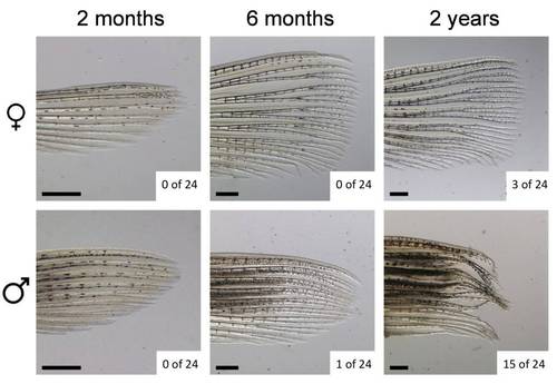 Aging Male Zebrafish Display Atrophied Pectoral Fins A high proportion of males display bilateral pectoral fin defects at 2 years, including atrophy, ray folding, and ray fusion, while these conditions are rare in females. n = 24, Fisher-Irwin exact test, *p < 0.05. |