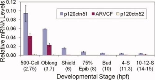 p120 catenin δ1 is the predominant p120 catenin mRNA in early developing embryos. Real-time PCR was used to make a quantitative analysis of relative expression levels of p120 catenin δ1, p120 catenin δ2a, and ARVCF at various stages from 500-cell to 12-somite embryos of developing zebrafish. Relative amounts were calculated using the 2-ΔΔC(t) method to standardize target gene expression to an endogenous standard (EF-1α). Plotted values represent the mean of all 2Standarized ΔC(t) for a developmental stage and primer combination, ± 2 s.e.m. See Supp. Figure S1 for more details. For most stages and primer combinations N = 6. EXPRESSION / LABELING: