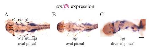The neural crest gene crestin is expressed in embryos with an open neural tube. sqt embryos with an open neural tube were identified by two-color WISH by first detecting flh in the pineal with a red precipitate (not shown as it is out of the focal plane of the image). The crestin signal in the neural crest cells was then detected via a purple precipitate. (A) In WT embryos, crestin is expressed in a large region next to rhombomeres 4–6 (open arrowheads), and in two stripes of cells on the left right sides at the borders of the folding neuroepithelium. ((B) and (C)) In sqt embryos with an open neural tube, both regions of crestin are present, although they are further apart. The experiment was repeated three times and representative images are shown. Embryos were fixed at the 8–10 somite stage. All images are dorsal views with anterior to the left. Scale bar=50 μm. EXPRESSION / LABELING: