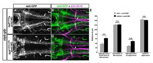 Lateral positioning of longitudinal otpb:gfp-positive axons is altered in arnt2hi2639c mutants. Dorsal views of confocal z projections of the hindbrain of otpb:gfp transgenic embryos co-labeled with anti-GFP and anti-3A10 (A-D) at 72 hpf are shown. (A,B) Wild-type siblings display normal medio-lateral positioning of otpb:gfp positive axons (arrows in A). (C,D) In arnt2hi2639c/hi2639c homozygous mutants, longitudinal projections of otpb:gfp axons are shifted towards the midline (arrows in C). Midline crossing of Mauthner axons is not affected in arnt2hi2639c mutants, suggesting grossly normal hindbrain development (compare arrowheads in B,D). (E) Quantification of mediolateral positioning of otpb:gfppositive longitudinal axons at the anterior-posterior level of Mauthner neurons (see III in B), of the distance of MA neurons (see II in B) and of otpb:gfp hindbrain neurons (see I in B) in arnt2hi2639c/hi2639c homozygous mutants or wild-type siblings. Numbers in parentheses indicate the number of embryos analyzed. ***P<0.0001; n.s., not significant. Scale bar: 50 μm. |