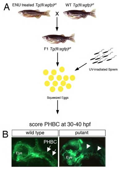 Transgenic haploid screen in Tg(fli1a:egfp)y1 zebrafish to identify mutants affecting Vegfc/Flt4 signaling. (A) Tg(fli1a:egfp)y1 males were treated with N-ethyl-N-nitrosourea (ENU) to induce mutations in the pre-meiotic germline and subsequently outcrossed to wild-type Tg(fli1a:egfp)y1 females to establish F1 families. Eggs from individual F1 females were fertilized in vitro with UV-irradiated sperm from wild-type males to generate haploid embryos. (B) Epifluorescence images of cranial blood vessels in Tg(fli1a:egfp)y1 haploid embryos. (Left) Normal primordial hindbrain channel (PHBC) formation (arrows) at 28 hpf. (Right) Putative mutant embryo (‘putant’), which failed to form a PHBC (arrowheads denote location where PHBC normally forms). |