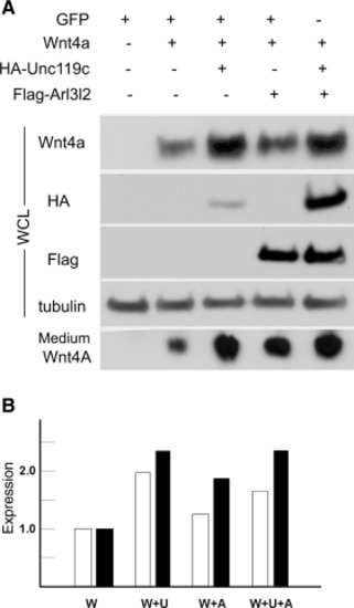 Cultured HEK293T cells were transiently transfected with Wnt4a, with or without HA-Unc119c and Flag-Arl3l2, as described in the Experimental Procedures section. A: Wnt4a, Unc119c, and Arl3l2 in whole cell lysates were detected by immunoblotting, while secreted Wnt4a was recovered from the medium by immunoprecipitation before blotting. B: Quantification of the gel using ImageJ shows the level of Wnt4a extracted from cells (open bars) or recovered from the medium (filled bars). Cells were transfected with Wnt4a (W), Wnt4a and Unc119c (W+U), Wnt4a and Arl3l2 (W+A), or all three (W+U+A). The level of expression in the Wnt4a lane was set as one. |