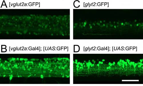 High levels of GFP expression driven by Tg[vglut2a:Gal4] and Tg[glyt2:Gal4]. Comparisons of GFP expression between the simple transgenic fish (Tg[vglut2a:GFP] and Tg[glyt2:GFP]) and the corresponding Gal4 transgenic fish. Images were taken from fish that were 3.5 dpf. (A,B) Lateral views of the spinal cord in the Tg[vglut2a:GFP] transgenic fish and the Tg[vglut2a:Gal4]; Tg[UAS:GFP] compound transgenic fish. Higher levels of GFP expression occurs in B. (C,D) Lateral views of the spinal cord in the Tg[glyt2:GFP] transgenic fish and the Tg[glyt2:Gal4]; Tg[UAS:GFP] compound transgenic fish. Higher levels of GFP expression occurs in D. Scale bar: 50 μm. |