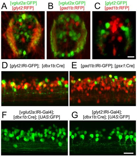 Transgenic fish associated with neurotransmitter properties. All images were taken from fish that were 3.5 dpf. Genotypes of the transgenic fish are shown at the top of each panel. (A-C) Cross-sections of the spinal cord. Green and red cells do not overlap, indicating that each transgenic fish labels discrete cell populations. (D-G) Lateral views of the spinal cord. (D) Glycinergic neurons derived from dbx1b-positive progenitors are labeled by GFP. (E) GABAergic neurons derived from gsx1-positive progenitors are labeled by GFP. In D and E, neurons in which Cre-mediated recombination did not occur continued to express RFP. (F,G) Glutamatergic neurons (F) and glycinergic neurons (G) derived from dbx1b-positive progenitors are labeled by GFP. Only the green channel is shown. Scale bars: 10 μm (A-C); 20 μm (D-G). |