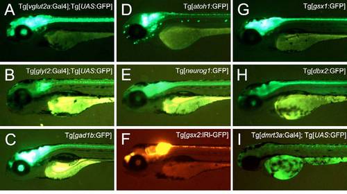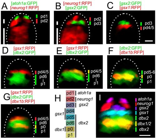 Progenitor domains in the dorsal spinal cord. Images were taken from embryos that were 36-48 hpf. All images are cross-sections of the spinal cord. Genotypes of the transgenic fish are shown at the top of each panel. (A) The atoh1a expression domain is located in the dorsal-most spinal cord. The short and long white lines show the dorsal and ventral neurog1 expression domains, respectively. The dorsal neurog1 expression domain is located just ventral to the atoh1a expression domain. (B) The gsx2 expression domain is located just ventral to the dorsal neurog1 expression domain. (C) The gsx2 and gsx1 expression domains are adjacent to each other. (D) The gsx1 and dbx2 expression domains are adjacent to each other. (E) In this image, the gsx1 expression domain is within the dbx2 expression domain (yellow). (F) The dbx1b expression domain is located in the middle of the dbx2 expression domain (yellow). (G) The gsx1 expression domain (red) and the dbx1b expression domain (yellow) are separate. (H) Summary of the domain organization. (I) Composite image of the expression domain of each transcription factor. For neurog1, only the dorsal expression domain is included. Scale bars: 10 μm. |
